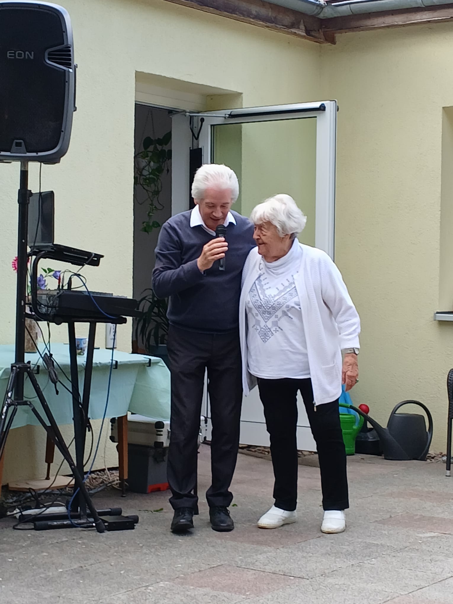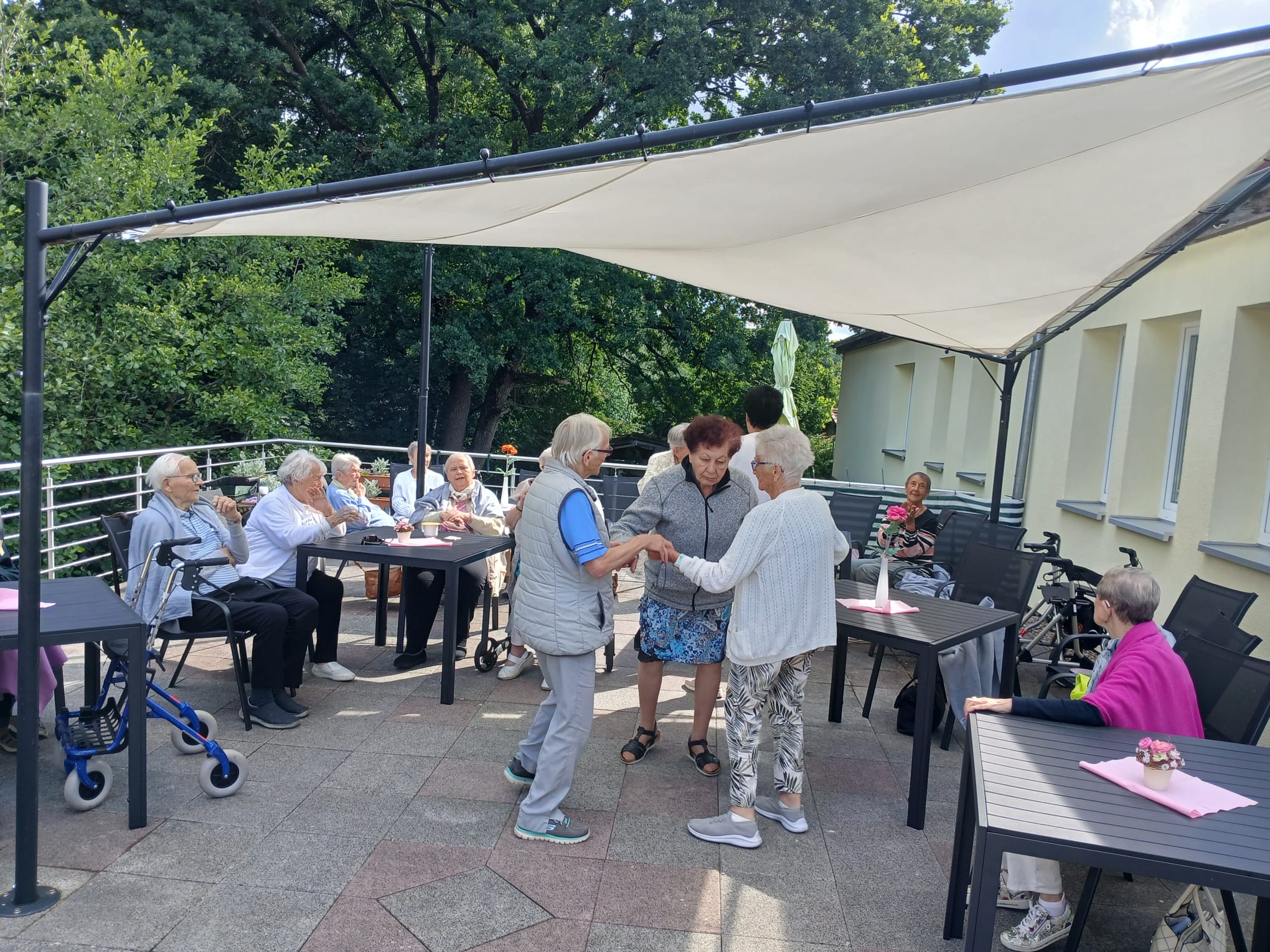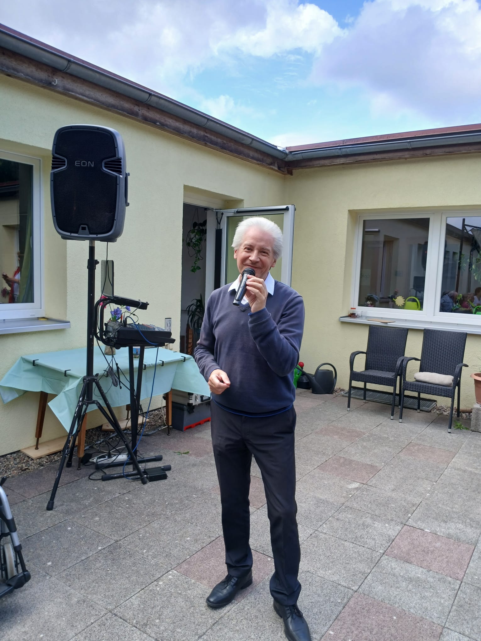 Schon am Morgen wurden die Tagesgäste herzlich an der Eingangstür empfangen und nach dem gemeinsamen Frühstück ging es für alle Tagesgäste auf die schöne Terrasse, denn Herr Daniel Gläser hatte sich dieses Mal zur musikalischen Umrahmung angesagt. Während er alt bekannte Schlager und Volkslieder aus seinem Repertoire vortrug und die Tagesgäste dazu animierte kräftig mitzusingen, zu schunkeln und das Tanzbein zu schwingen, gab es für alle ein Gläschen selbst gemachte Schlammbowle.