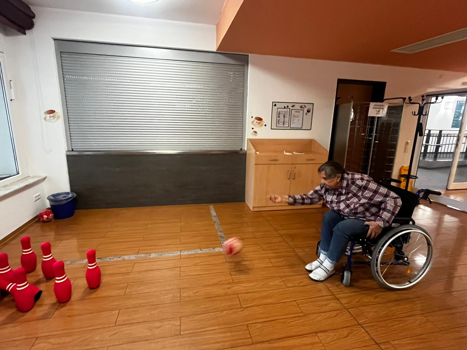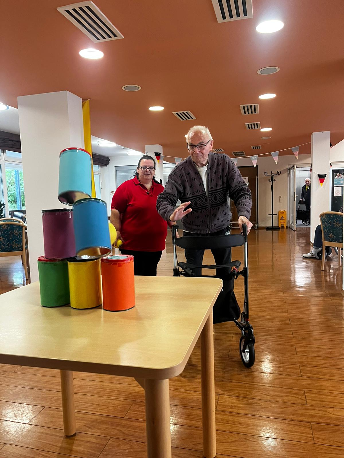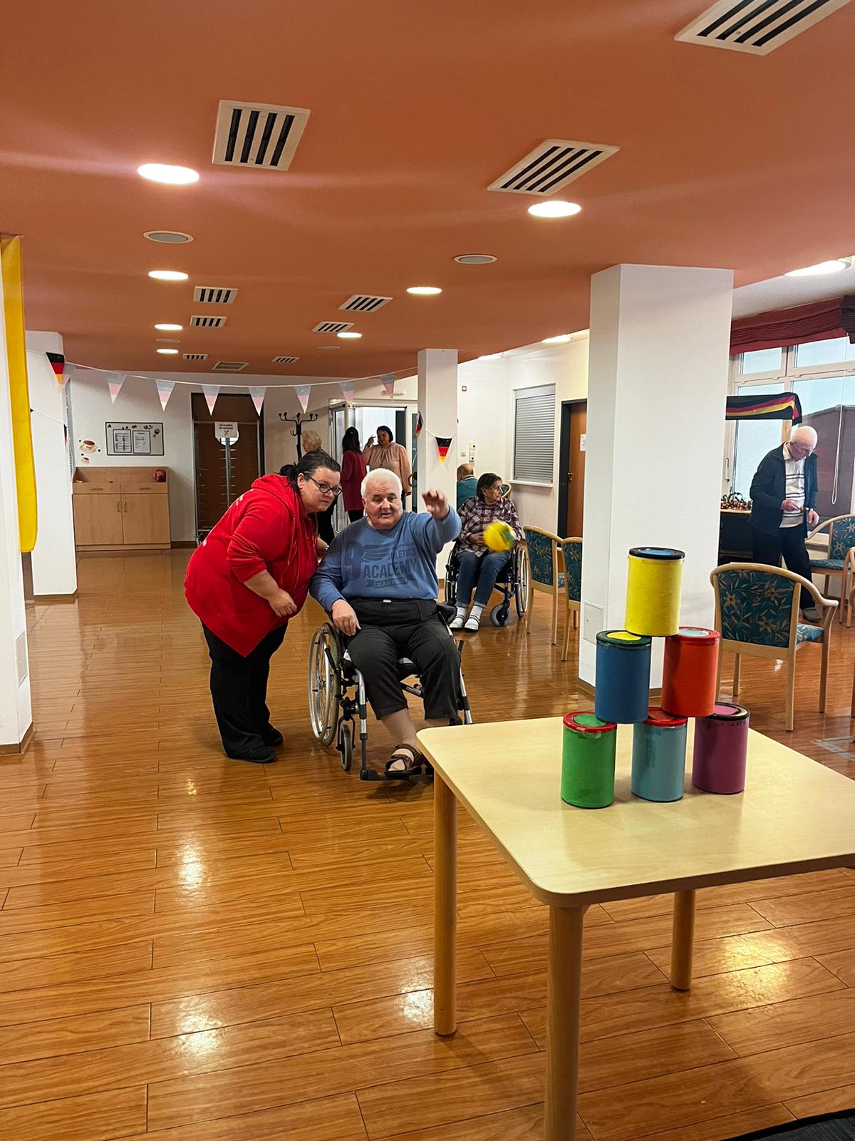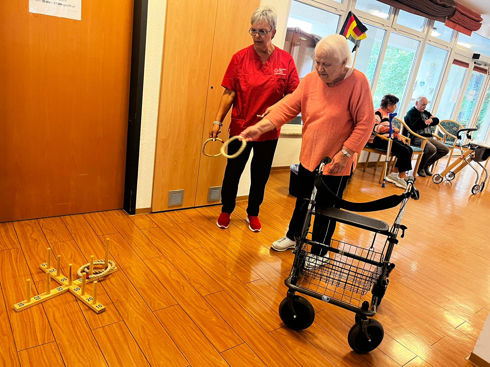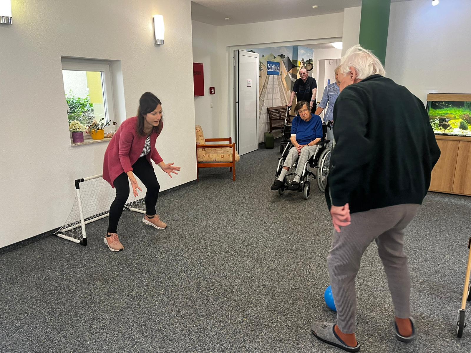 Auf dem Programm standen spannende Disziplinen wie Dosenwerfen, Ringwerfen, Bowling, Torwandschießen und ein Sportquiz. Die Bewohner, die dank der wöchentlichen Seniorengymnastik gut trainiert waren, beteiligten sich mit vollem Einsatz und viel Begeisterung an den Aktivitäten. Es war beeindruckend zu sehen, wie vital und engagiert sie waren – so manch einer staunte über die eigenen Fähigkeiten und darüber, was in ihm noch steckt.