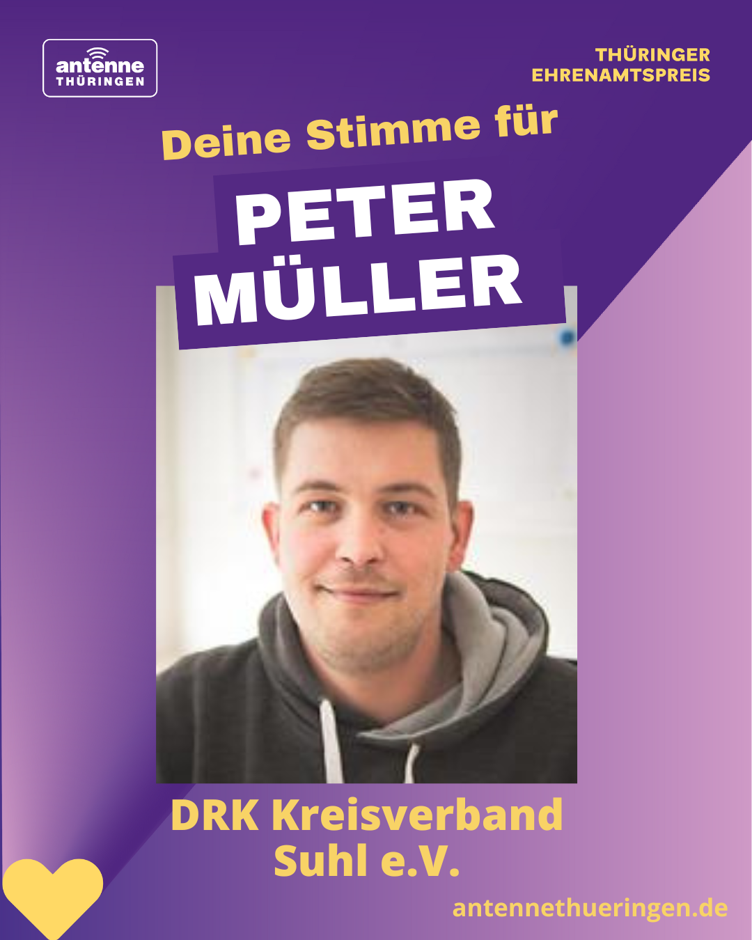Unser DRK-Held Peter Müller ist für sein herausragendes Engagement für den Thüringer Ehrenamtspreis 2025 nominiert worden – und zählt bereits zu den Top 10 Finalisten. Nun geht es in die nächste Phase: Vom 2. Juni bis zum 13. Juni 2025 kann täglich online für ihn abgestimmt werden.
